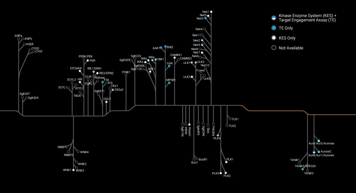 1. In the image below, click anywhere or on a kinase group name to enlarge that branch of the human kinome. Within the enlargement, the kinases available in the Kinase Enzyme Systems and/or NanoBRET® Target Engagement (TE) Intracellular Kinase Assays will be displayed by different colors on the tree.